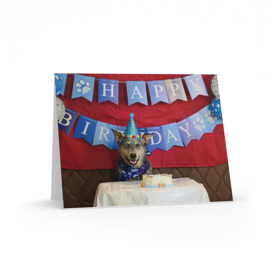 Blue Heeler Birthday Greeting Card - Adorable Canine Celebrating with Cake and 'Happy Birthday' Banner (8, 16, and 24 pcs - Blank)